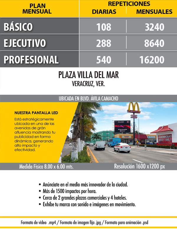 Pantalla de Leds, el medio m innovador para exhibir tu marca o servicio, ubicada en la mejor zona comercial y turÃstica de la ciudad. Somos la única con sonido, para tener un mayor impacto, con una afluencia de más de 1500 vehÃculos por hora.